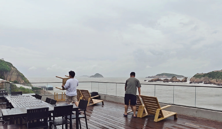 昨天,在嵊泗花鸟岛,花鸟乡应急分队队员帮助岛上一家民宿业主及时清理户外桌椅,避免遭受损失 记者 滕海平 通讯员 刘畅乔摄