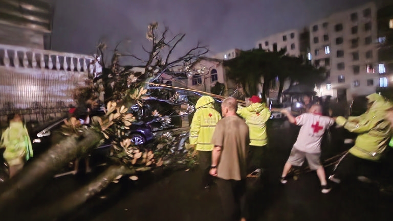 昨晚7点50分,定海桔园南区一棵大树倒下,压住了两辆车子。市红十字水海上应急救援队出动13名队员,利用绳索、汽油锯等工具,将树清理至路边。经过近1小时的救援,险情被成功排除。 通讯员 陶文燕摄