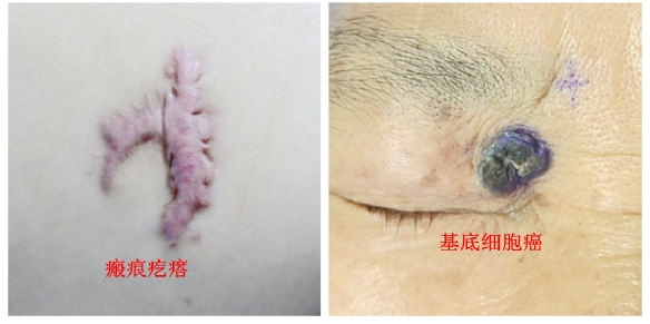 基底细胞癌 好发于面部,呈珍珠样结节或溃疡,易局部浸润。