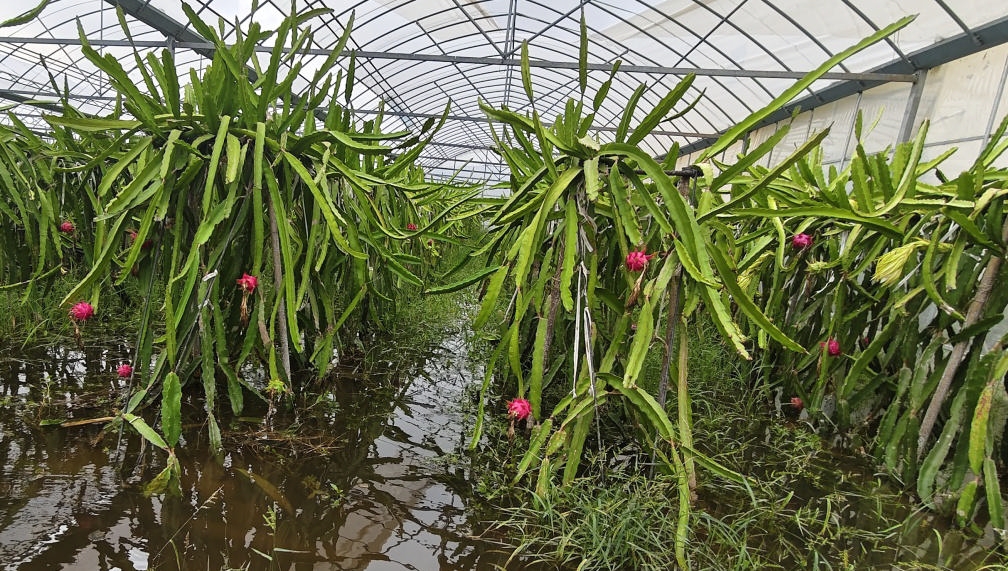 台风“竹节草”过后,台州银行工作人员走访客户时,发现舟山吉蕊生态农业专业合作社种植的火龙果受灾严重。据种植户介绍,台风期间,大棚内积水最深达1米,昨天经过一天的紧急排水,还有30亩左右受淹。虽然及时抢收下来的火龙果还能继续销售,但销路成了难题。