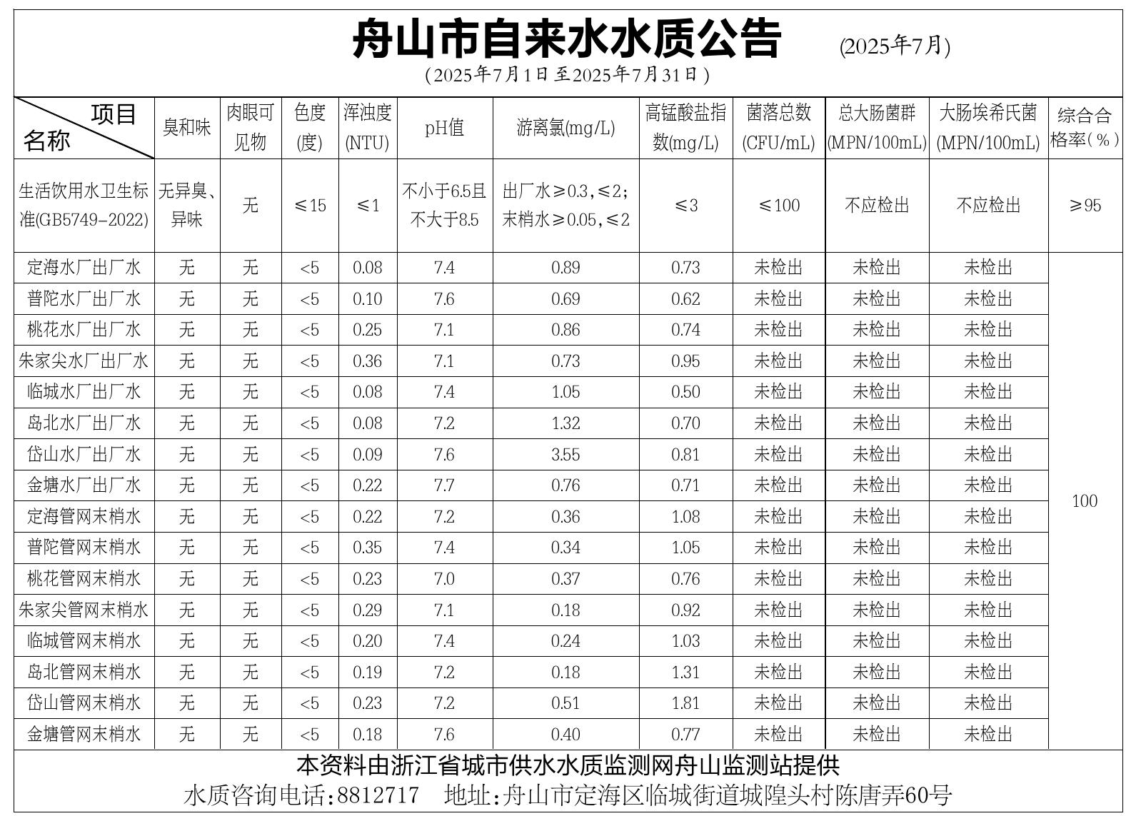 舟山市自来水水质公告
