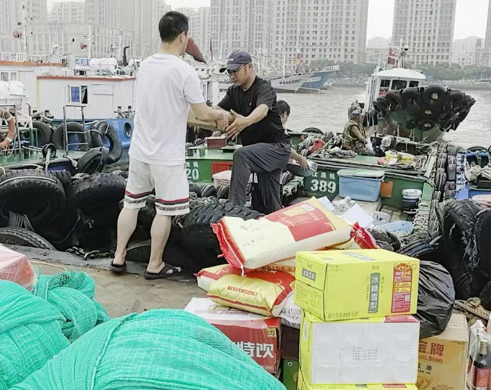 昨天早上7点多,天气有些灰蒙蒙的,普陀沈家门渔港码头却是一派繁忙热闹的景象。十几艘渔运小舢板在码头边一字铺开,渔民们正忙着往船上装载出海所需的渔具和生活物资,运往锚泊的渔船上。