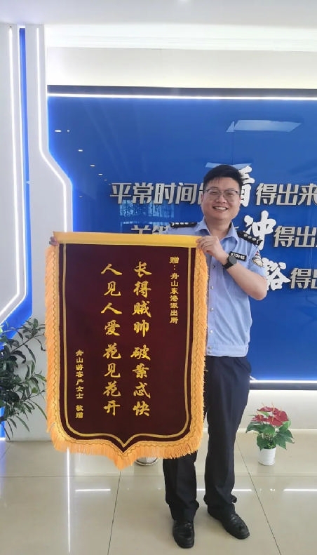 据浙江舟山公安微信公众号消息近日,普陀东港派出所辅警余磊收到一面外地寄来的锦旗。“长得贼帅 破案忒快 人见人爱 花见花开”,如此“显眼”的锦旗让他笑开了花。