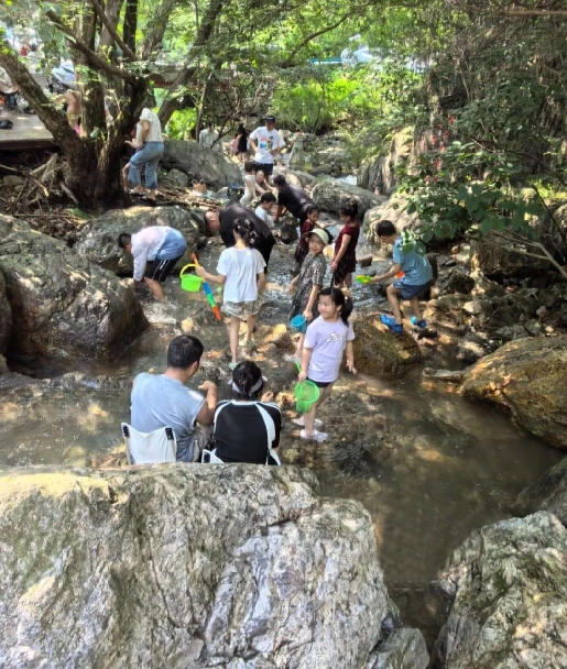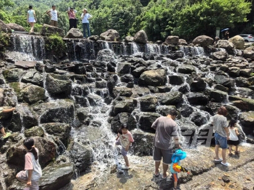 “和朋友一起,我们两家人上午9点就来了,没想到这里有好几处溯溪的地方,三个小孩一直玩到下午3点多,特别凉快。”来自江苏的孙先生笑着说道,“不是水乐园玩不起,而是溯溪更有性价比。”