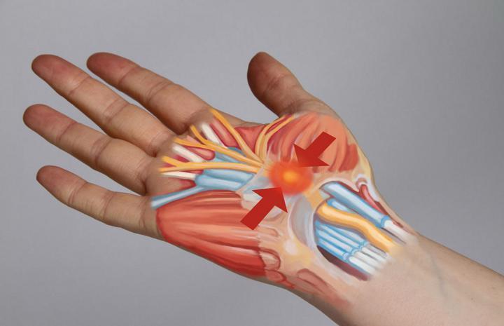 在人体手腕部掌侧有一个骨性纤维管道,称为腕管,由于长时间重复手腕动作等各种原因挤占了腕管的空间,就会引起腕管内压力增高,正中神经受到压迫,引起疼痛等一系列症状。