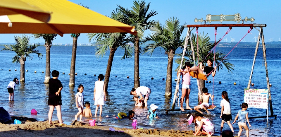 人们在哈尔滨市松花江畔戏水游玩。