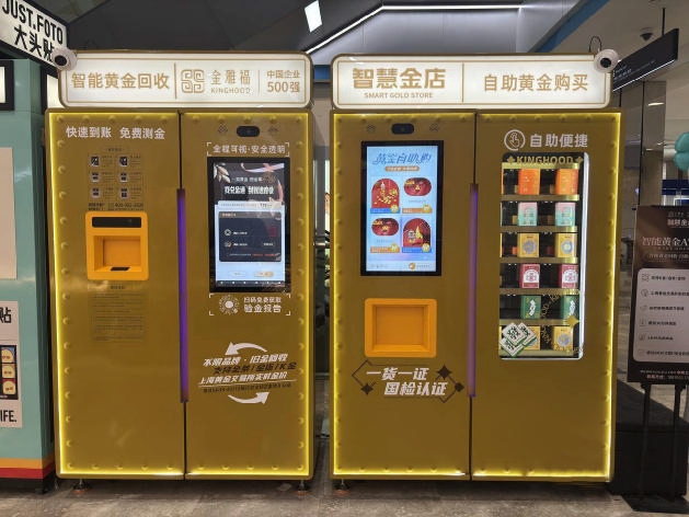在杭州庆春银泰百货,记者见到了两台通体黄色的智能机器:一台是“智能黄金回收机”,设备上标注着“快速到账”和“免费测金”的字样;另一台是“自助黄金购买机”。