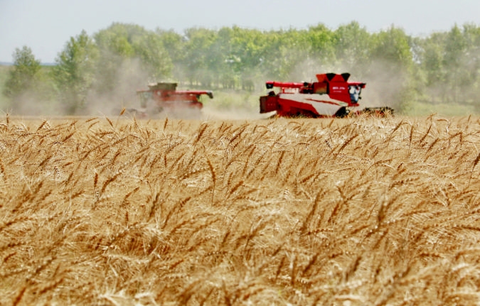 8月5日,位于黑龙江省五大连池市的大庆油田农场调动多台联合收割机抢收小麦。