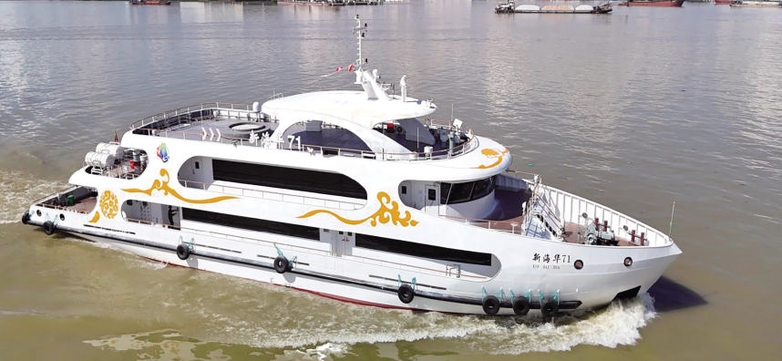 船舱内,航空头等舱标准的设施令人眼前一亮——大面积观景舷窗、皮质座椅、大理石桌面,让游客在航行中即可享受“海上观光”的惬意。387个客位布局宽敞,告别传统客船的拥挤,旅途舒适度大幅提升。这艘新船的启航,不仅为游客带来更高品质的出行体验,也为普陀山旅游经济注入了新活力。
