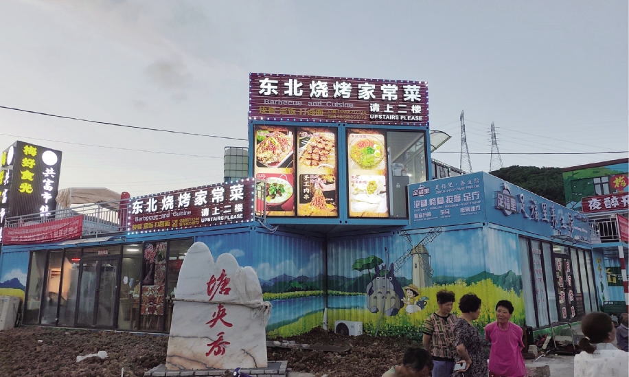 夜幕降临,这是一片被“烟火气”笼罩的乡村市集。有热烈的歌唱伴奏,也有升腾起的东北烧烤、刘记川菜馆的香味。身着工作服的船厂工友,钻入一间间集装箱商铺,打开一瓶瓶啤酒,点上一盘回锅肉,就着一碟花生米,度过他们的闲暇时光。一旁,同样是集装箱做成的厨房间,老板亲自掌勺,“咔嚓咔嚓”三下五除二就端出一盆菜,老板娘忙着点菜算账……