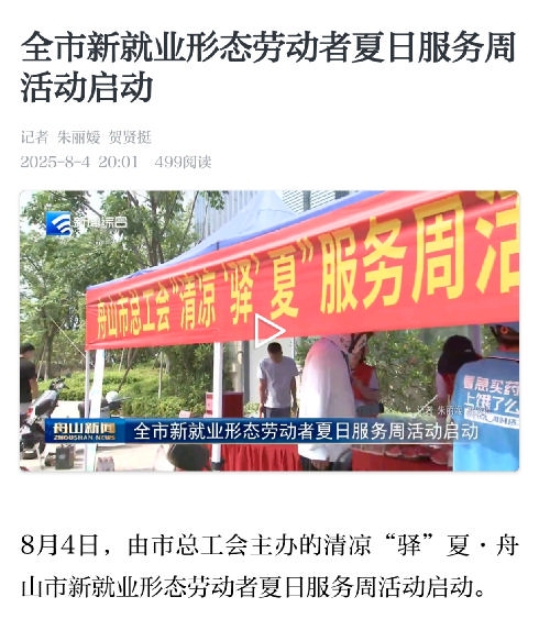 日前,由市总工会主办的“清凉‘驿’夏,舟山市新就业形态劳动者夏日服务周”活动在新城拉开序幕,为辛勤忙碌的新业态劳动者们送上了一份贴心的“清凉”关怀(《舟山晚报》8月5日报道)。希望这样的活动能引起普遍关注、广泛参与,并最终推进制度建设,让新业态劳动者更有获得感。