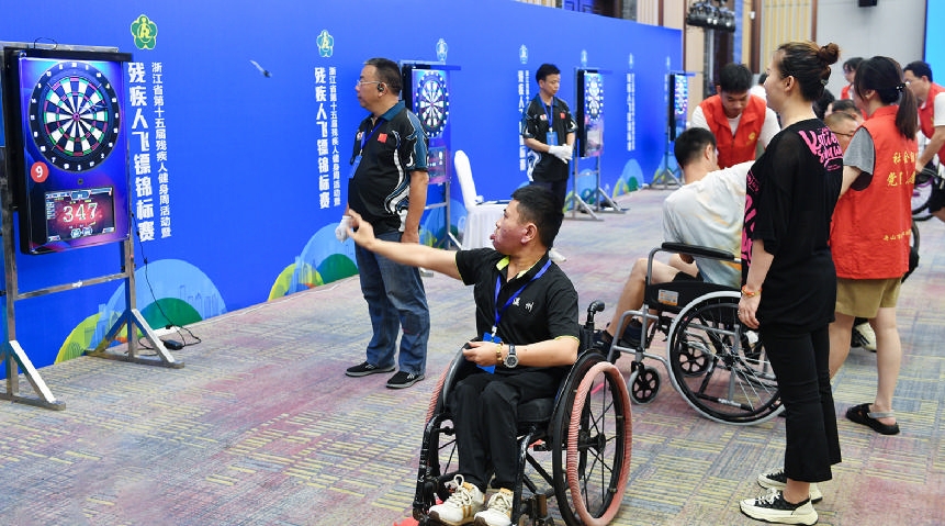 8月7日,浙江省第十五届残疾人健身周活动暨“宁波钢铁杯”残疾人飞镖锦标赛决赛在舟山举行。本次比赛为个人赛,设肢体坐姿组、肢体站姿组、听力残疾组组别,全省11地市60名运动员参赛。最终,舟山选手林龙、夏露分获坐姿组冠亚军,陈磊夺得听力残疾组冠军。记者 沈磊 陈永建 摄