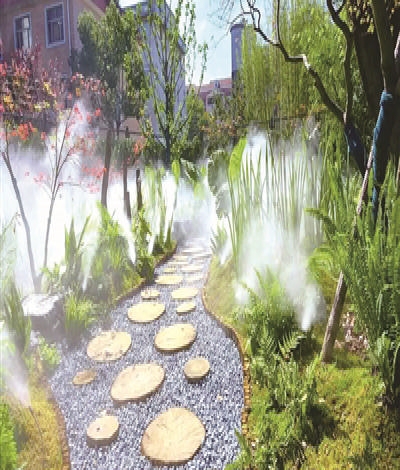 公园里,玉兰花瓣造型的廊架现代简约。沿小路往里走,云雾缭绕,仙气飘飘。原来这是为耐阴花境制作的雾森系统。炎炎夏日,雾森系统每10分钟“吞云吐雾”一次,每次约10分钟,一方面改变植物生境,另一方面增加湿度和负氧离子。