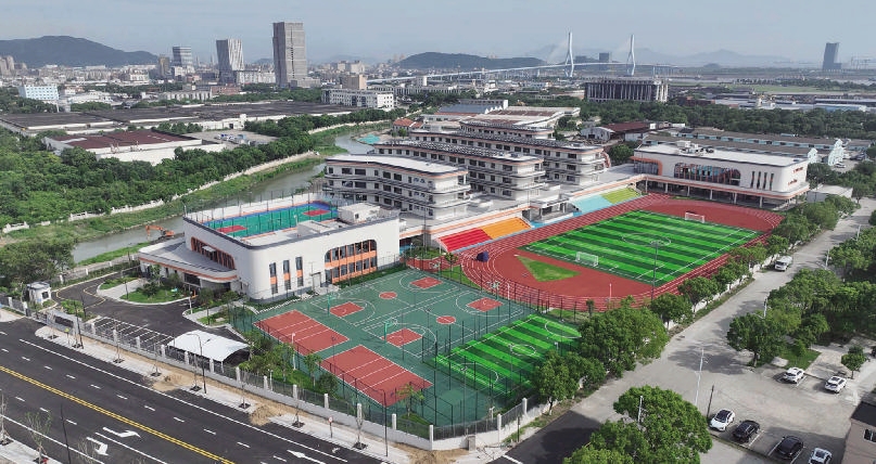 8月10日,新城海力生路东侧,新建成的舟山第一小学东校区靓丽夺目,成为一道风景。据了解,该工程总投资2.29亿元,总建筑面积25086.17平方米,设有教学楼、行政楼、共享平台等9幢建筑,设计规模36个班,将于今年9月份正式投用。 记者 陈永建 摄