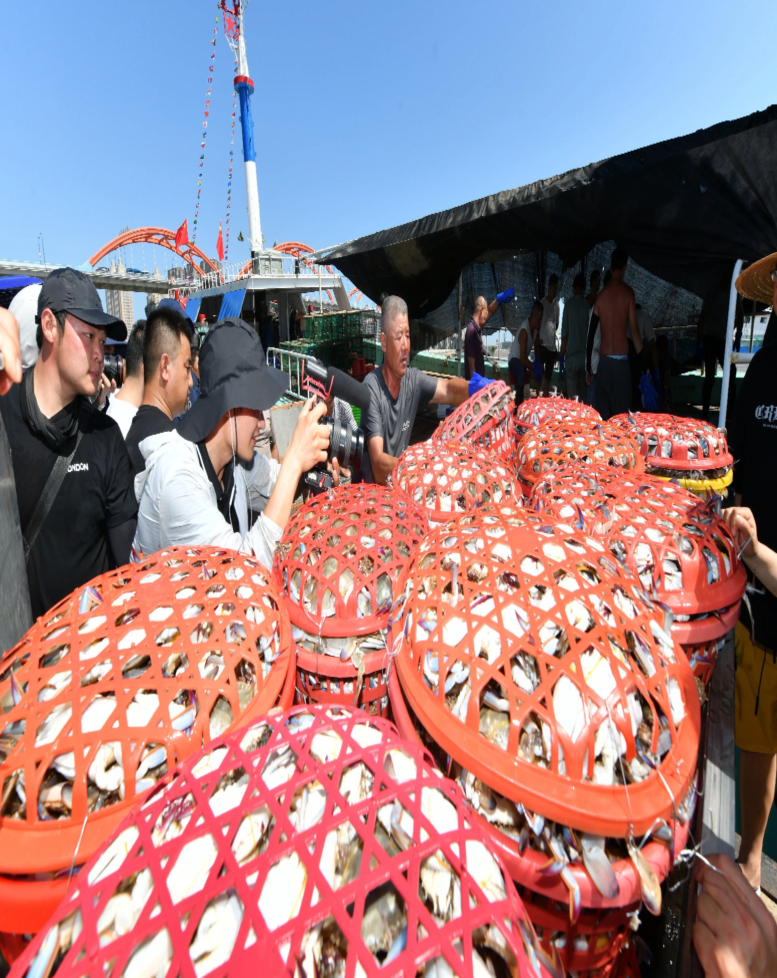 舟山国际水产城人声鼎沸,码头上泊满了正在卸货的渔船,一筐筐新鲜的梭子蟹被搬出货舱,运输上岸,等待多时的各路商贩一拥而上,迅速抢购一空。