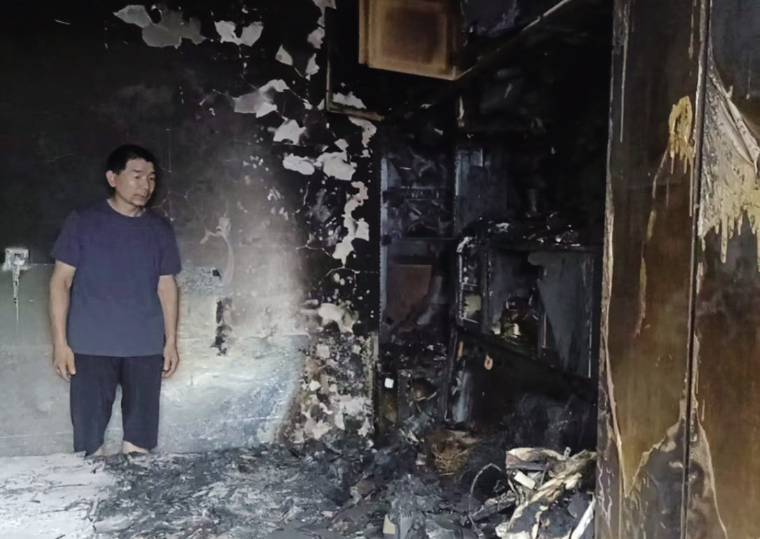 王福营在鱼山岛浙江石油化工有限公司工作,租住在岱山县高亭镇一套两室一厅的老房子里。记者现场看到,室内已被烧得一片狼藉,床烧了个大洞、柜子已经碳化,电器被烧变形,“当晚8点左右,我从外面散步回家,家里已经烧得差不多了,我就用水把火扑灭了。”