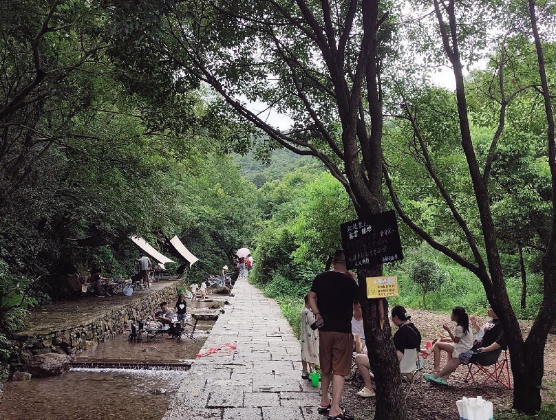 8月初的一个周末,记者根据导航“寺岭村”,沿着定马线,经过一段山路来到这里,早有市民在溪坑里摆上露营桌,孩子们光着脚在嬉水。一边的平地,有人搭了天幕,在树荫下喝茶聊天。
