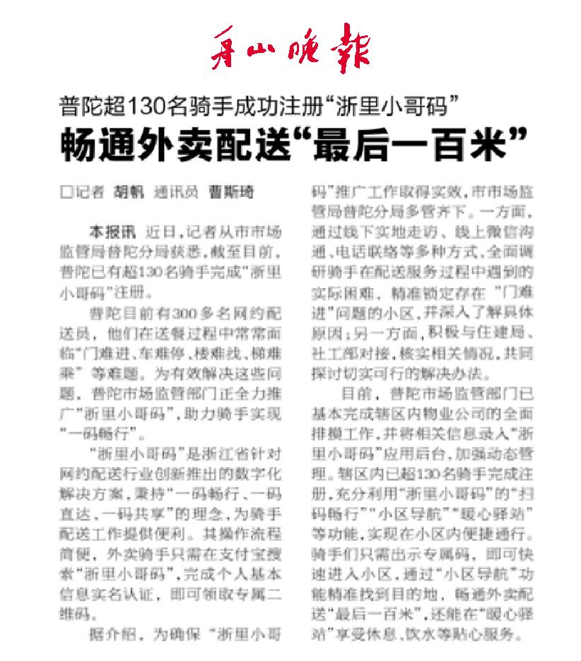 炎炎夏日,普陀外卖骑手在小区门前掏出手机轻触屏幕,三秒后,“浙里小哥码”核验成功,他径直进入,将冰饮准时送达。舟山这枚小小的二维码,不仅破解了骑手“门难进、车难停、楼难找、梯难乘”的“最后一百米”梗阻,更在数字时代中照见了城市治理的温度。