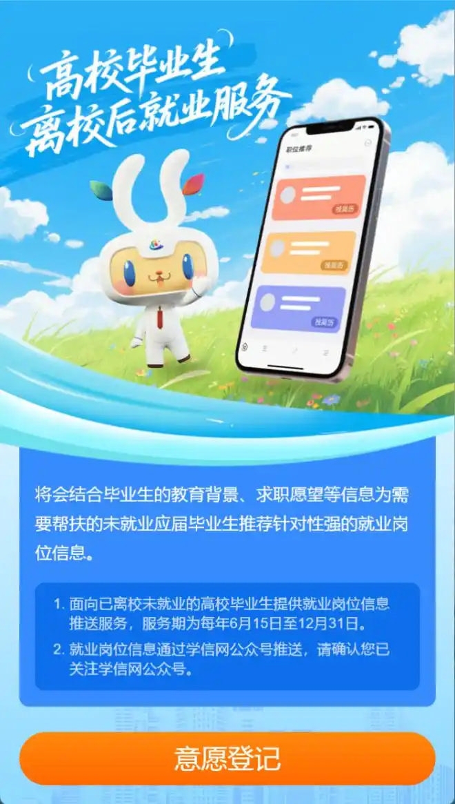 “高校毕业生离校后就业服务”小程序汇集国家大学生就业服务平台内岗位信息,结合毕业生的教育背景、求职期望等,为离校未就业毕业生持续推荐针对性强的就业岗位信息。