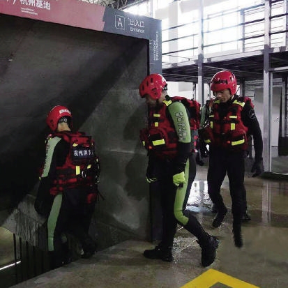 8月13日下午,杭州市临平区消防救援大队在侣行(杭州)基地进行了两场还原真实内涝场景的安全演练。记者亲身体验在城市内涝的险境中如何自救。