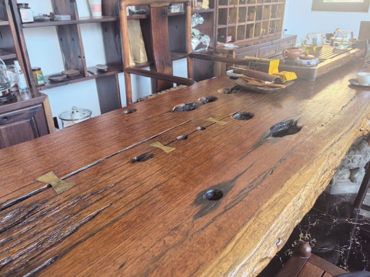 “这块茶盘上的黑色曲线,其实是当年船板拼接时留下的缝隙,海水顺着缝隙渗透,与铁钉发生化学反应,才形成了这种独特的肌理。”李海军指着自己喝茶用的茶具解释,“我们不会刻意掩盖这些痕迹,因为这是老船木最珍贵的部分,每一道纹路都是渔船与海浪搏斗的记录。”在李海军的车间里,每一块老船木都被赋予了新的生命。