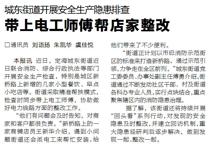 定海城东街道联合消防、综合行政执法等部门,近日开展安全生产检查,城区新桥路上新增的几家小型餐饮、早点小吃店等是重点部位。街道在检查时同步带上电工师傅,协助店家做好电力线路方面的整改工作,受到普遍好评(《舟山晚报》8月14日报道)。