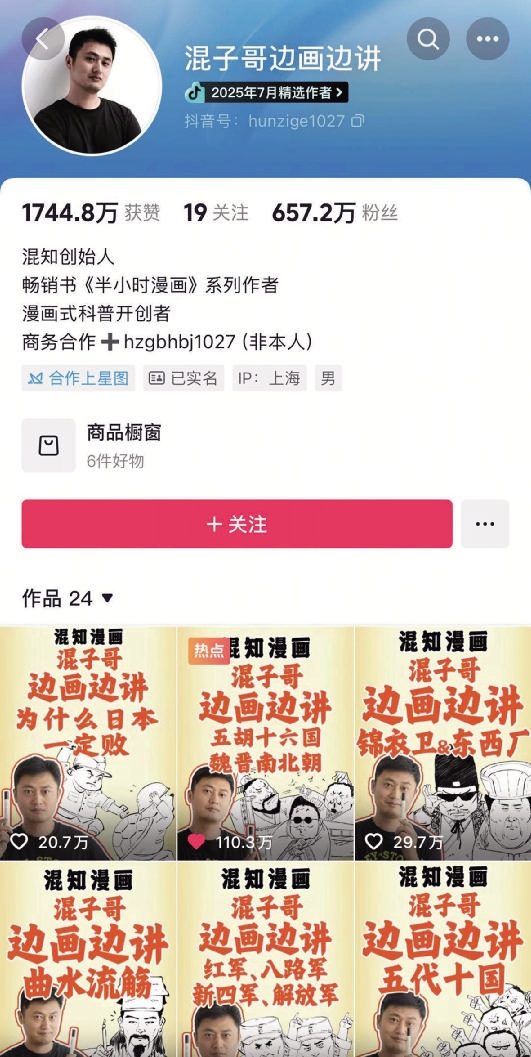 他的漫画,在符合历史真实的情况下加入有趣设定,还时常爆梗,让大家看完忍俊不禁。他用这种方式讲解了“中国人的姓和氏”“三皇五帝”“龙生九子都有谁”等话题,几乎每一期都是爆款,点赞数十万,最高的一期有1.3亿浏览量,两个月时间迅速吸粉600多万。“我不光自己看,还带着儿子看!”“现代版神笔马良!视频刷到停不下来,再也不用边上课边偷看漫画了!”“看一遍就学会了,感觉自己强得可怕!”粉丝们的热情让“混子哥”觉得两个多月前做的决定是对的——原来,他做图文漫画已经十年,最近,他开始将平面漫画变成立体视频呈现给读者,没想到粉丝们“相见恨晚”。