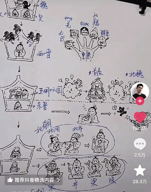 两个月吸粉600多万他的视频看得停不下来打开“混子哥”的视频,爱看漫画的小伙伴们有福了。每期视频中,他都会坐在一个白板前,用马克笔边画漫画边讲解历史故事!漫画的加持,让原本遥远而陌生的历史人物变得生动形象,让复杂的人物关系变得清晰直观……比如“混子哥”自己最满意的一期——《讲解五胡十六国和魏晋南北朝》。学过历史的小伙伴们都知道,五胡十六国和魏晋南北朝时期,朝代更迭飞快,很多知识点十分难记,那么如何快速厘清?只见“混子哥”大笔一挥,在白板上画个房子比喻当时的疆土,用住在房子里的小人比喻朝代,把三国时期画成魏蜀吴三个小人“合租”三个单间;西晋时期是一个小人住着单间,被五个少数民族小人偷偷爬到房顶;东晋时期则是一个小人与一堆小人一起住群租房……