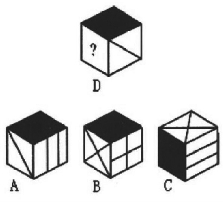 上图都是正方体。仔细观察图A-C,然后推算出图D的问号的一面是什么样的。
