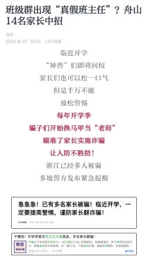 近日,有骗子混入定海某小学新生班级钉钉群,冒充班主任诱导家长进入新的聊群,要求缴纳“学杂费、体检费”共575元,并附上支付二维码。结果,5名家长上当受骗,在半小时内先后扫码,共计支付近3000元。所幸发现得早,真老师将假老师踢出了群(《舟山晚报》8月27日报道)。这一骗局虽然不算新鲜,但还是有家长不幸中招,足可见“班主任”的杀伤力。有鉴于此,防诈骗应是班级群的“第一课”。