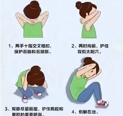 不慎倒地:设法靠近墙壁,身体蜷成球状,双手紧扣颈后,双膝尽量前屈,保护头部和胸腔。