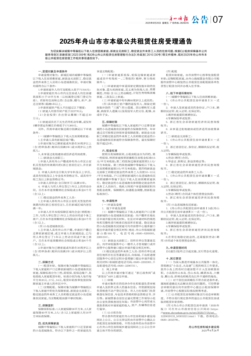 2025年舟山市市本级公共租赁住房受理通告