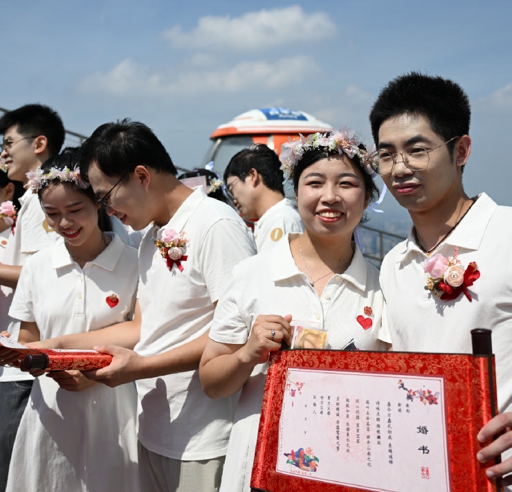 8月29日,“缘定七夕情满全运”2025年“花城有囍”集体婚礼活动在广州塔450米户外观景平台举行,15对新人在活动中喜结连理。 新华社记者 邓华 摄