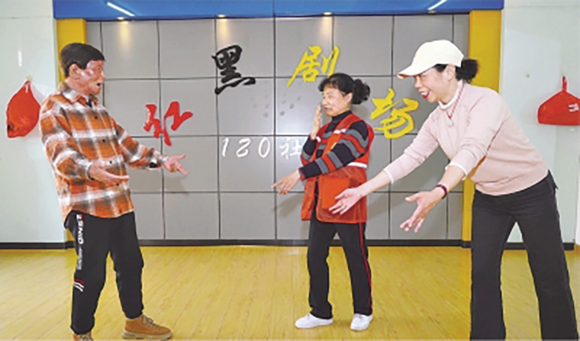 阮庆才(左)和居民朋友一起排演自编的情景剧