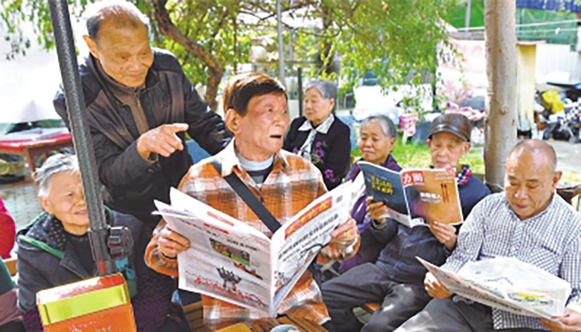 睦邻茶座是阮庆才(中)的宣传阵地,在与居民聊天和读报活动中,为大家宣传相关政策和健康知识