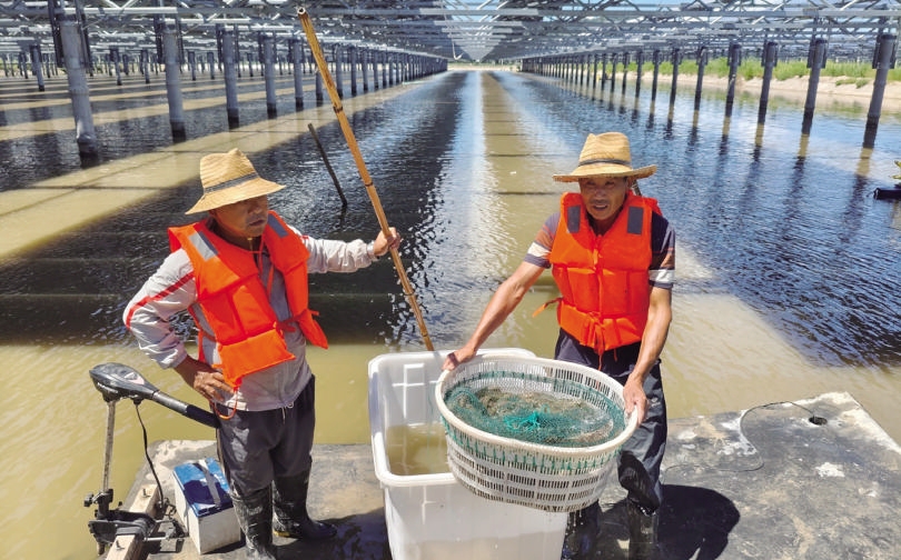 工作船在鱼塘间来往穿梭,随着渔网浮出水面,网眼中青褐色的对虾活蹦乱跳,不时溅起水花。这不仅是一次收获,更是对“渔光互补”项目实际成效的重要检验。