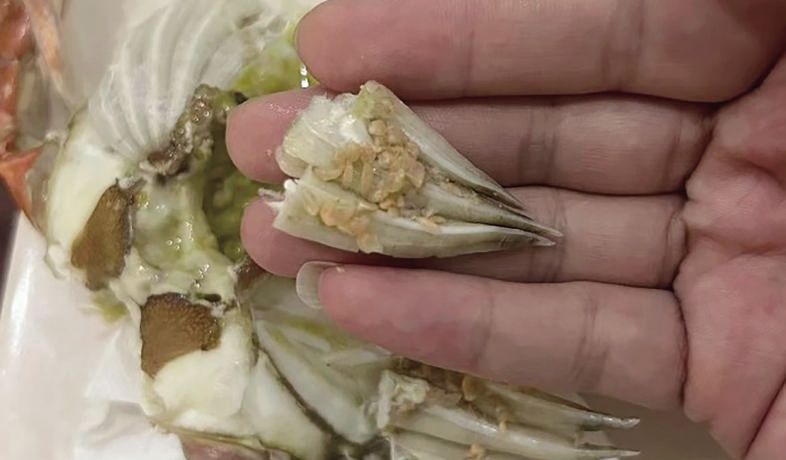 而最近,杭州、宁波等地网友发现螃蟹布满了粉色小颗粒,看起来像是寄生虫卵。它们吸附在梭子蟹的腮瓣里面,一拨开蟹腮密密麻麻全是,甚至感觉它们还在不停地活动,有点惊悚。