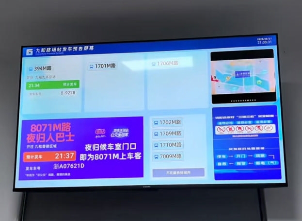 “夜归候车室”内的预告屏滚动显示预约车辆到达时间、行驶状态。 杭州公交集团供图