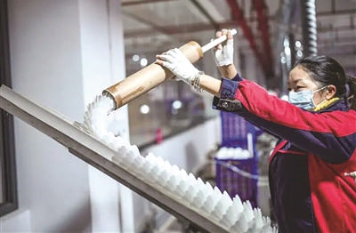 贵州省锦屏县的某羽毛球生产基地,工人将羽毛球半成品投入生产机器 据新华社