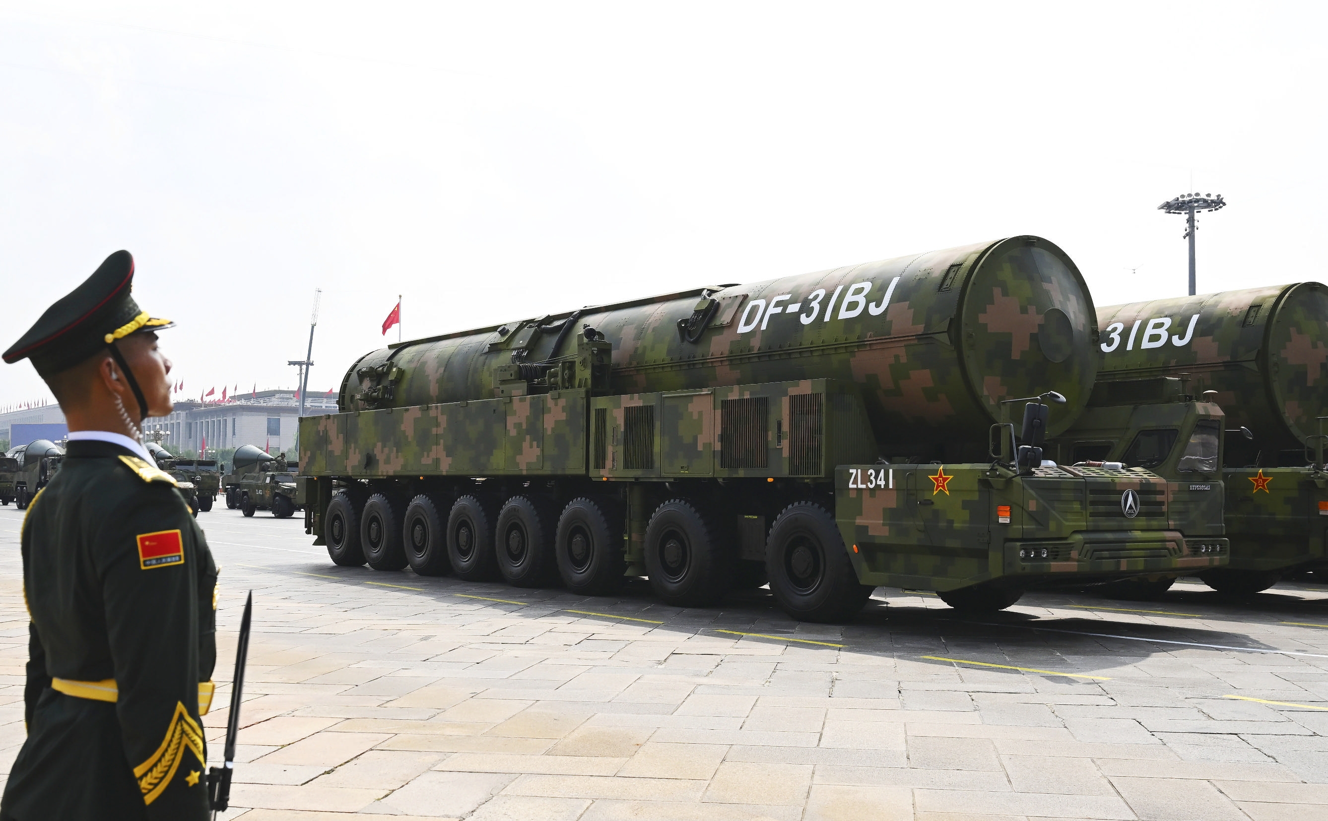 12台大型导弹运输车载着“东风-5C”液体洲际战略核导弹浩荡而来。核导弹第二方队是装备方队压轴出场的方队。
