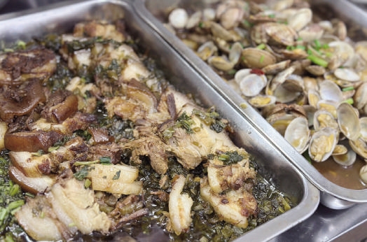 在定海解放东路的东园泡饭店,也有一碗泡饭,它出自一位三十年来始终扎根厨房的“阿姆”施亚凤之手。泡饭店里都是地道的舟山老下饭:葱烤肉、鳗鲞烤肉、红烧大肠、咸菜东坡肉、烤油豆腐、什烩羹、肉丝糊辣……每一样,都是老舟山人心心念念的“妈妈味”。