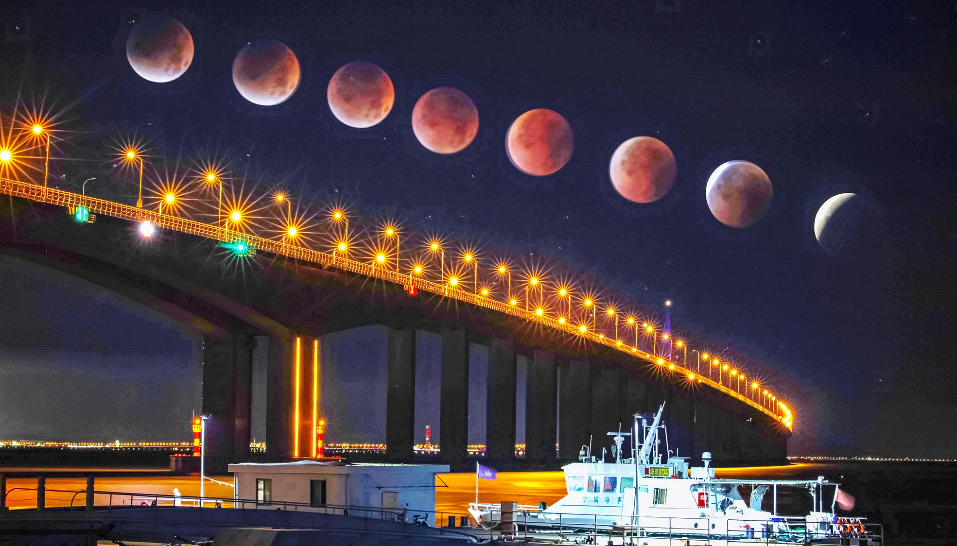 月全食第二阶段照片(多重曝光),摄于舟山金塘大桥 通讯员 姚峰 摄