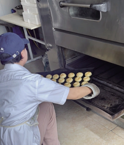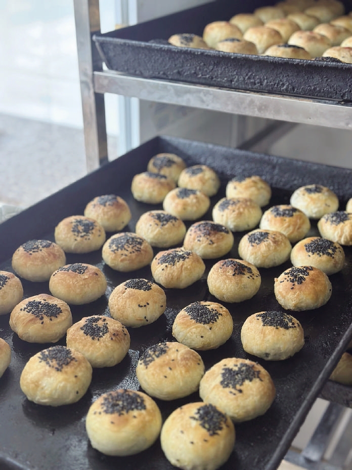 烤月饼讲究火候,要烤13~15分钟,中途还需人工翻面一次,确保受热均匀。当一板板金黄色的月饼从烤箱中取出,香气扑鼻,整个店铺都弥漫着幸福感。