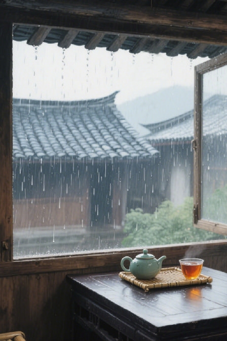 时间仿佛被这温柔的雨幕冲淡了流速,只剩下小院的方寸天地,一壶滇红,和一场不期而遇的酣畅淋漓。世界喧嚣褪去,唯有雨声、茶香与内心的宁静在对话。