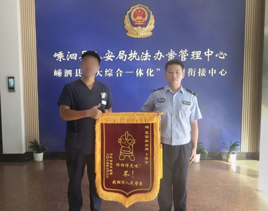 “你相信光吗?不!我相信人民警察!”男子将印着奥特曼的锦旗,递到卜思凯手中,表示对民警的由衷感谢。