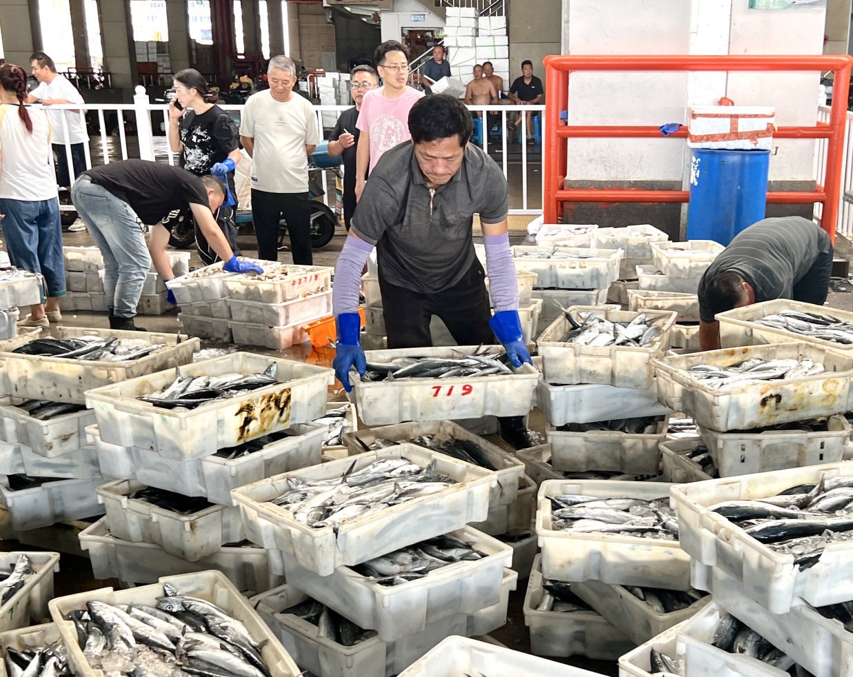 9月18日上午,舟山国际水产城人潮涌动。随着鱼货陆续到港,渔民、货车司机和采购商纷纷忙碌起来。5号码头,“浙普渔运48552”船正在卸货,工人们熟练地分类装筐,搬运工快步往来,将新鲜鱼货运送上岸。