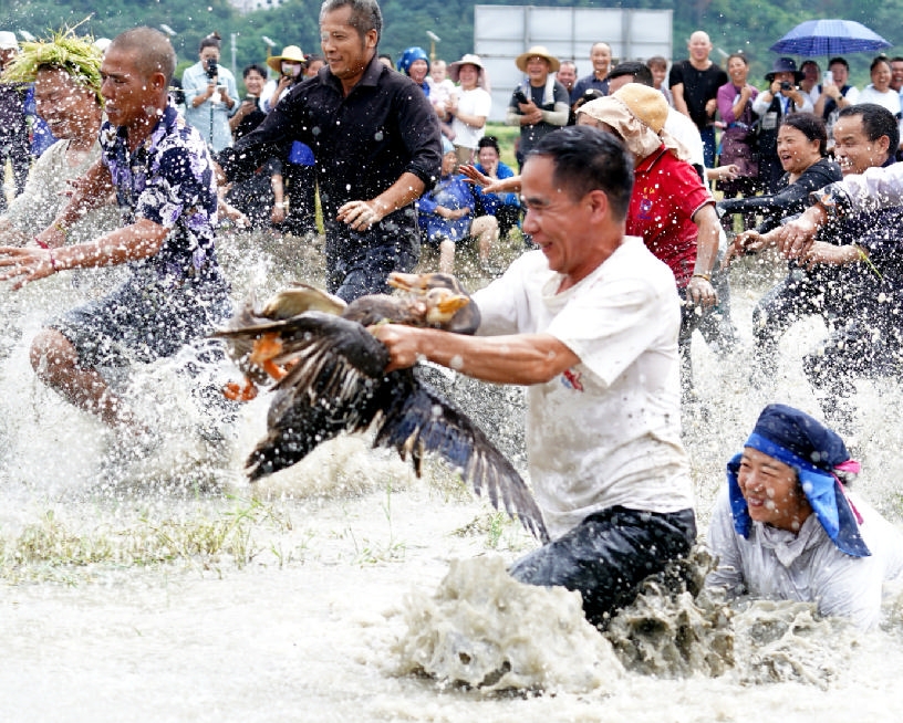 9月23日,在贵州省榕江县三宝侗寨举行的2025年中国农民丰收节分会场活动上,人们在参加捉鸭比赛。