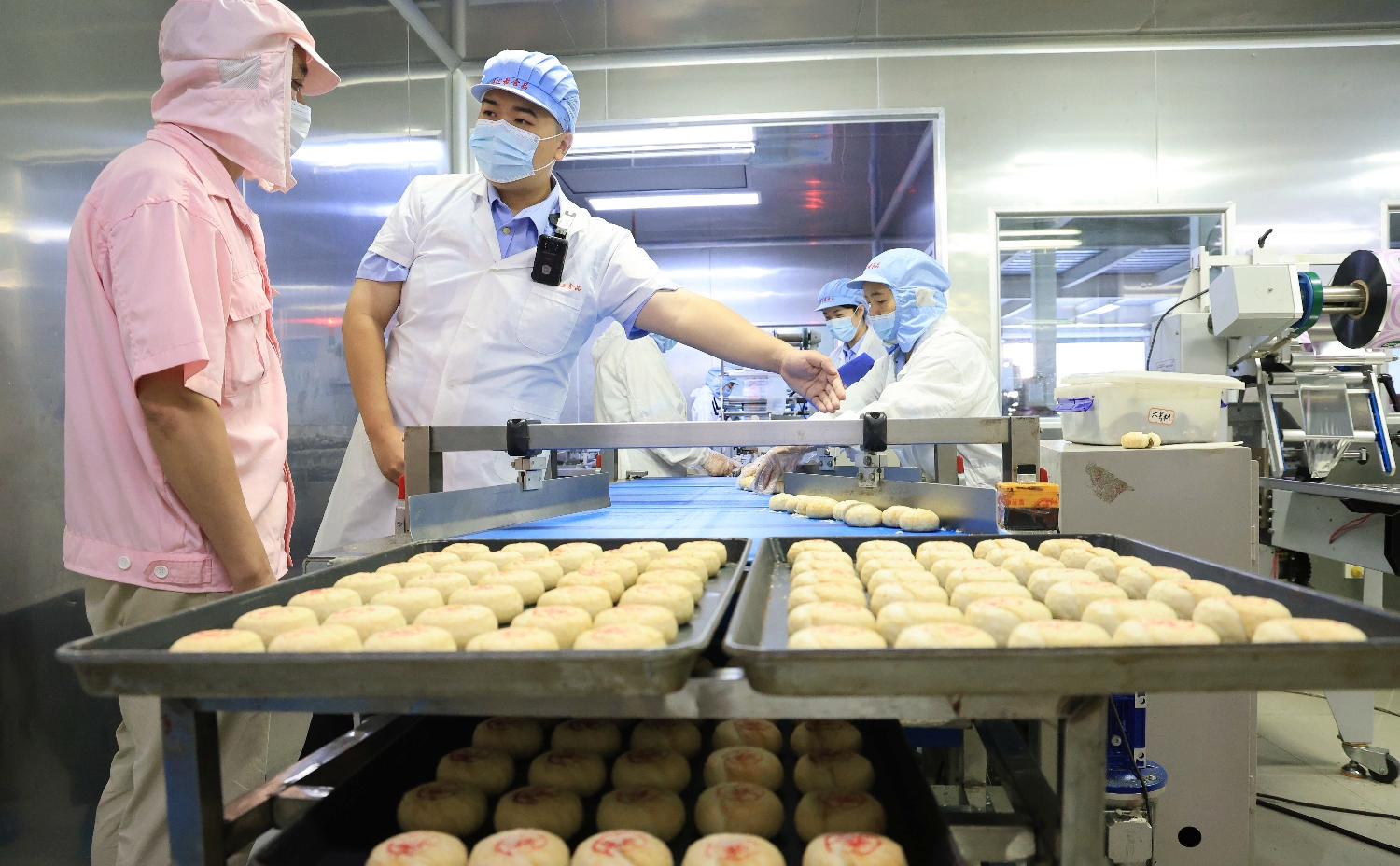国庆、中秋“双节”将至,昨天,舟山海之最食品有限公司月饼包装车间内,工人们正在赶制月饼供应节日市场。市场监管部门组织执法人员积极跟进加强质量管控和价格监督,并实地进入生产车间,重点关注车间环境卫生、员工穿戴管理、原辅料投料使用等方面,规范生产经营行为,倡导绿色消费理念。