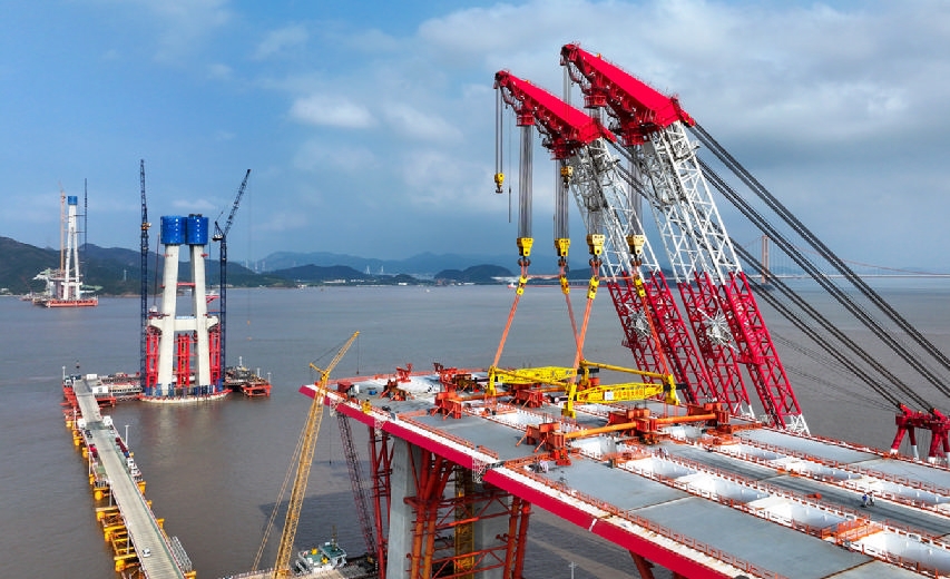 大桥两侧边跨钢梁全部架设完成,明年将进入主塔斜拉区大节段钢梁架设和上部结构安装