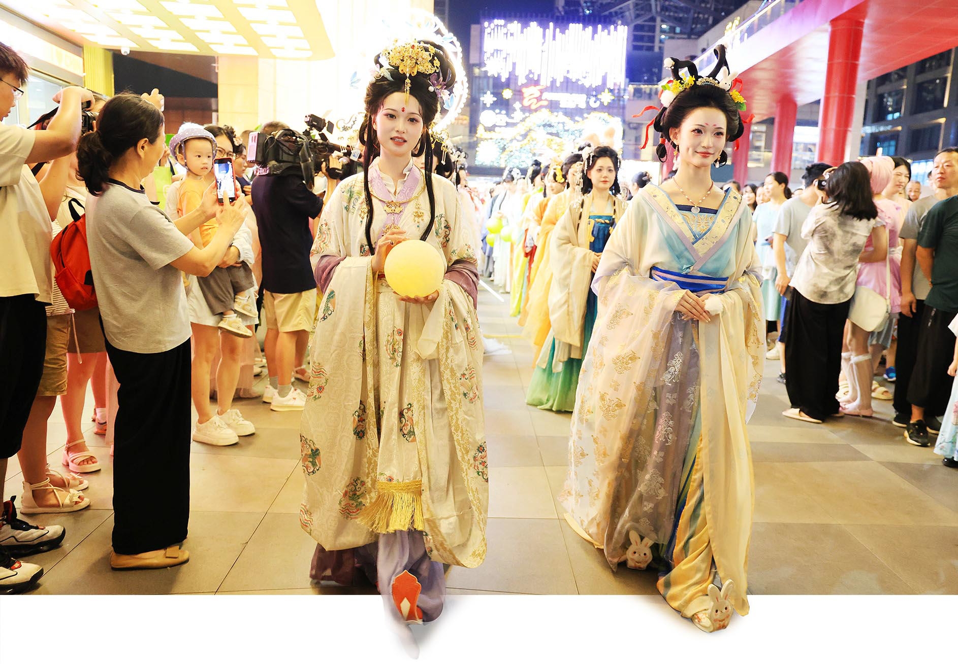 当日傍晚6时,宝龙广场“舟山”网红墙前人头攒动。15个主题摊位沿街道铺陈,非遗文化区围满市民,传承人现场演示技艺,引导市民体验。汉文化协会成员身着华服,扮作“嫦娥”“玉兔”,开启“寻月追光”巡游,古典乐舞与灯影交相辉映,孩子们提着手作灯笼穿梭其间,营造出“月下人团圆”的诗意场景。